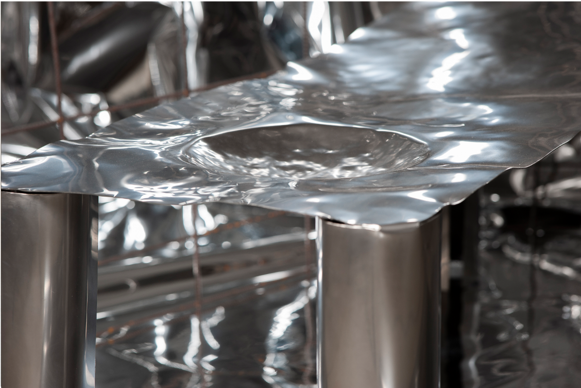 Stressed has been pushed and pulled from a single sheet of stainless steel. Exploring how a ductile material shows plastic deformation from heat, force and pressure whilst still maintaining structural integrity as a functional coffee table.