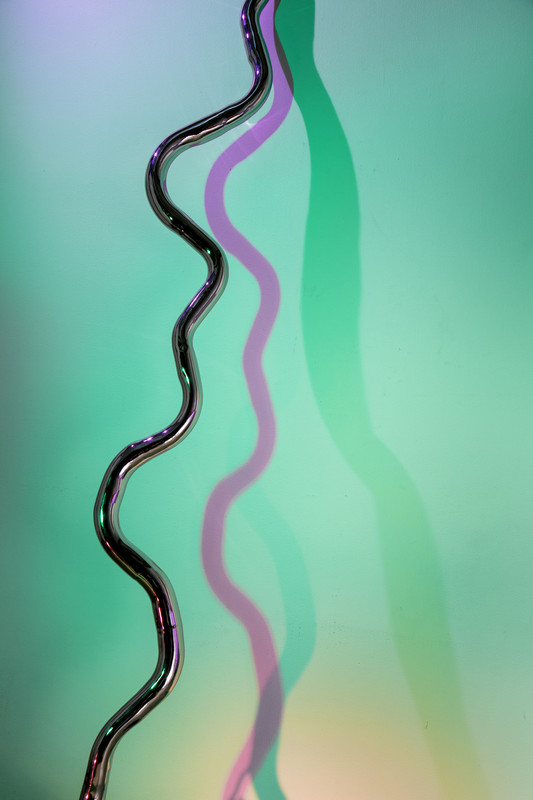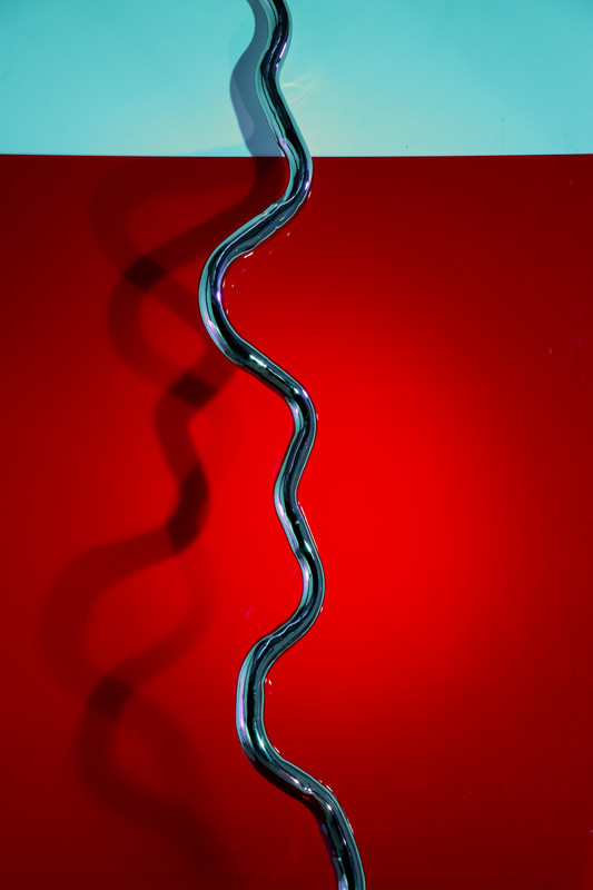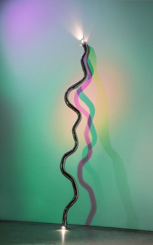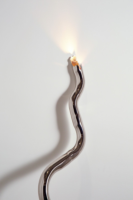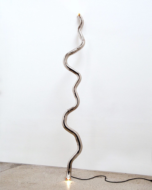 The approach of using found materials, welding, grinding, sculpting the form gives Exhausted its individualism, its marks, its boldness, its blemishes, its craftsmanship. No two lights will be the same, each form will be an organic unique piece. Resting in its environment, its striking wriggle reminds us of the versatility of reusing, its joins and marks give it a sense of humanity, its chrome finish highlights the motion of ‘polishing’ ‘covering’ ‘hiding’ on a moral and aesthetic level.